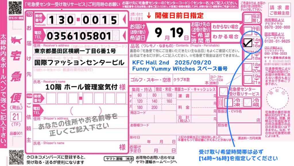 - 品目欄に「開催日」「会場名」「イベント名」「スペース番号」を必ず記入してください